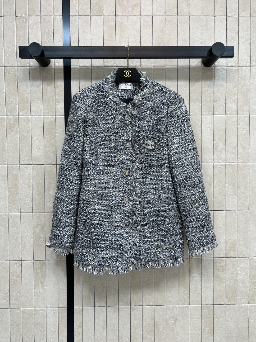 小香家新款灰色粗花呢外套經典小香風設計質感豐富又高級中長款及臀剪裁袖口和下擺流蘇點綴柔中帶剛幹練又優雅入金屬紐扣+logo紐扣點綴品牌感十足通勤、職場、日常都能輕鬆駕馭搭配同色系或淺色單品秋冬衣櫥必備百搭單品一色三碼SML